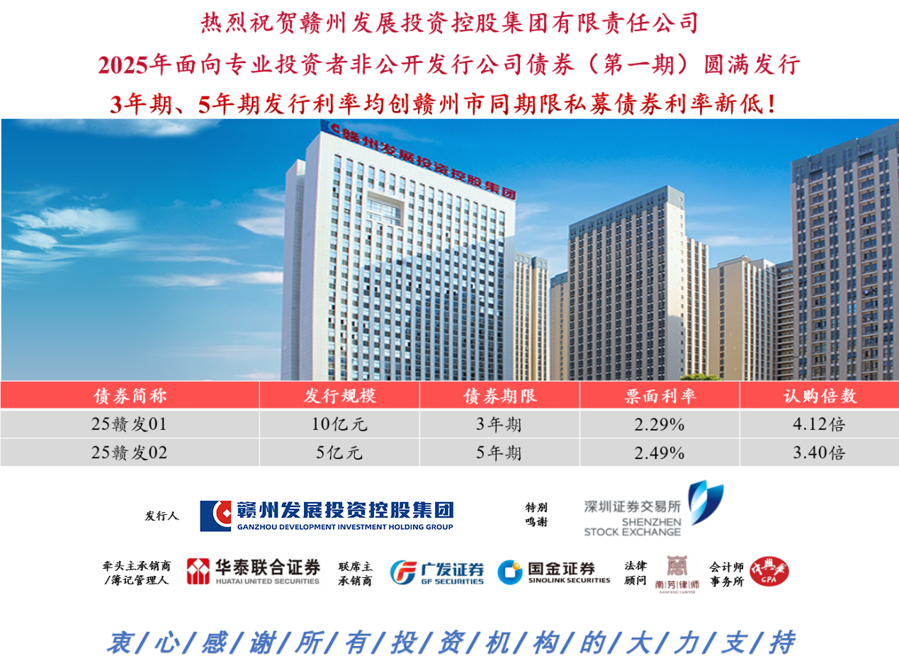 10月22日,赣州发展投资控股集团成功发行2025年度第一期公司债券。该债券由华泰联合证券牵头主承,广发证券、国金证券联席,总发行金额15亿元,设置3年、5年双期限互拨,其中,3年期发行金额10亿元,票面利率2.29%,全场认购倍数达4.12倍;5年期发行金额5亿元,票面利率2.49%,低于估值5个BP发出,全场认购倍数达3.4倍。上述两个期限品种发行利率均创赣州市同期限私募债券的历史新低。
