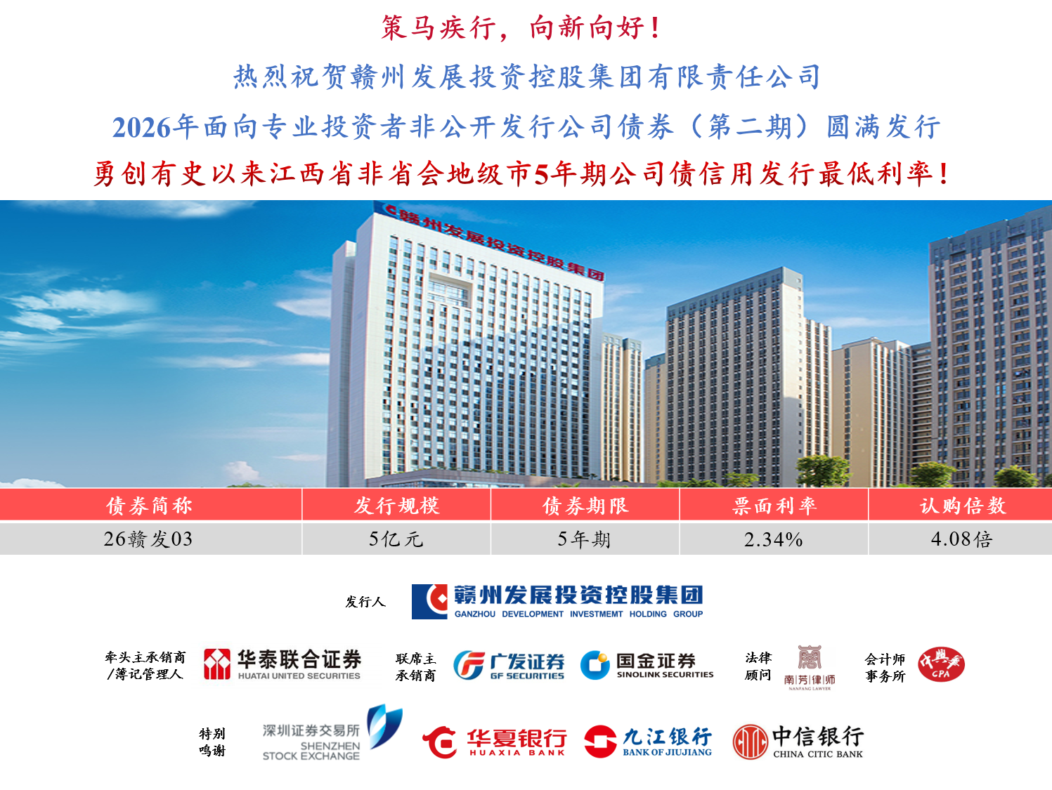 本次债券发行由华泰联合证券担任牵头主承销商及簿记管理人,广发证券、国金证券担任联席主承销商,得到了深圳证券交易所、华夏银行、九江银行、中信银行等机构的大力支持。在市场环境复杂多变的背景下,本次发行仍获得了专业投资者的踊跃认购,充分体现了资本市场对必赢net.95作为赣州市属核心骨干国企的信任与青睐,也为集团优化债务结构、降低融资成本、保障重点项目建设提供了坚实的资金支撑。